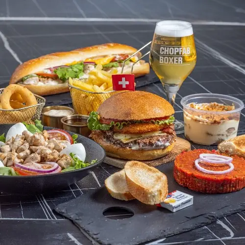 Le "Fresh Swiss" est un burger gourmet inspirĂ© de la Suisse, composĂ© de couches de rosti croustillantes, une gĂ©nĂ©reuse portion de fromage gruyĂšre et de raclette fondante, des tranches d'oignon, de la salade fraĂźche, des rondelles de tomate juteuse et de savoureuses tranches de bacon. Ce mĂ©lange riche et savoureux offre une expĂ©rience culinaire unique, mĂȘlant tradition suisse et plaisir du burger.